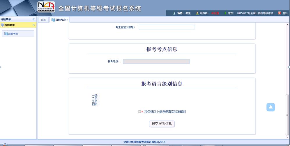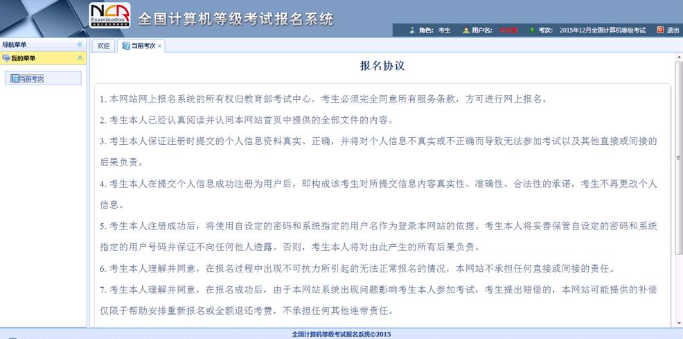 九、点击左侧导航菜单的“当前考次”阅读“报名协议”,点击同意协议,进入下一步