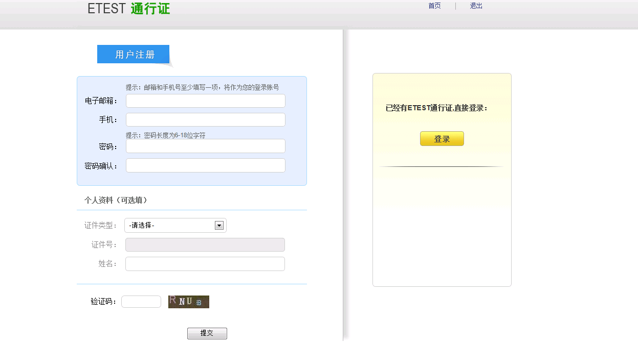 三、 考生填写资料、注册完毕帐号,使用etest通行证登录,如下图所示。