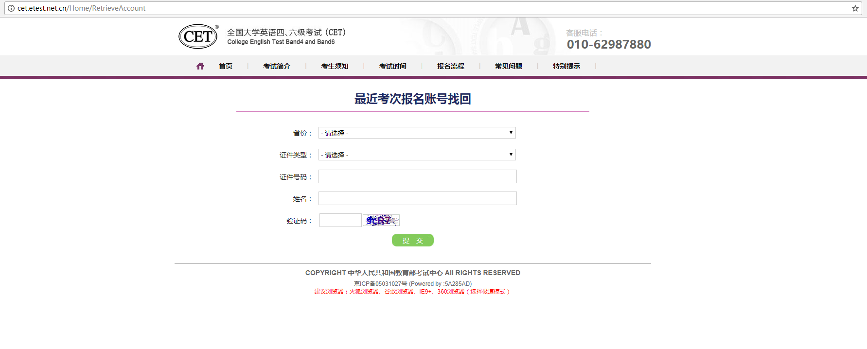 第六步: 打开“最近考次报名账号找回”页面。输入报名时的个人信息,点击“提交”,即可找回报名时的通行证账号信息。然后可按第一步流程登录系统,打印准考证。