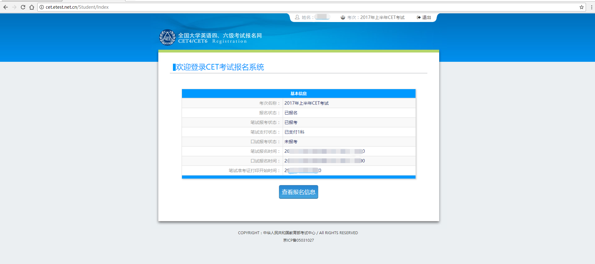 第三步: 登录成功,进入欢迎页面。(如果报名状态显示为“未报名或当前通行证账号非报名时账号”,说明当前登录账号非报名时账号,请看第五步)。点击“查看报名信息”。
