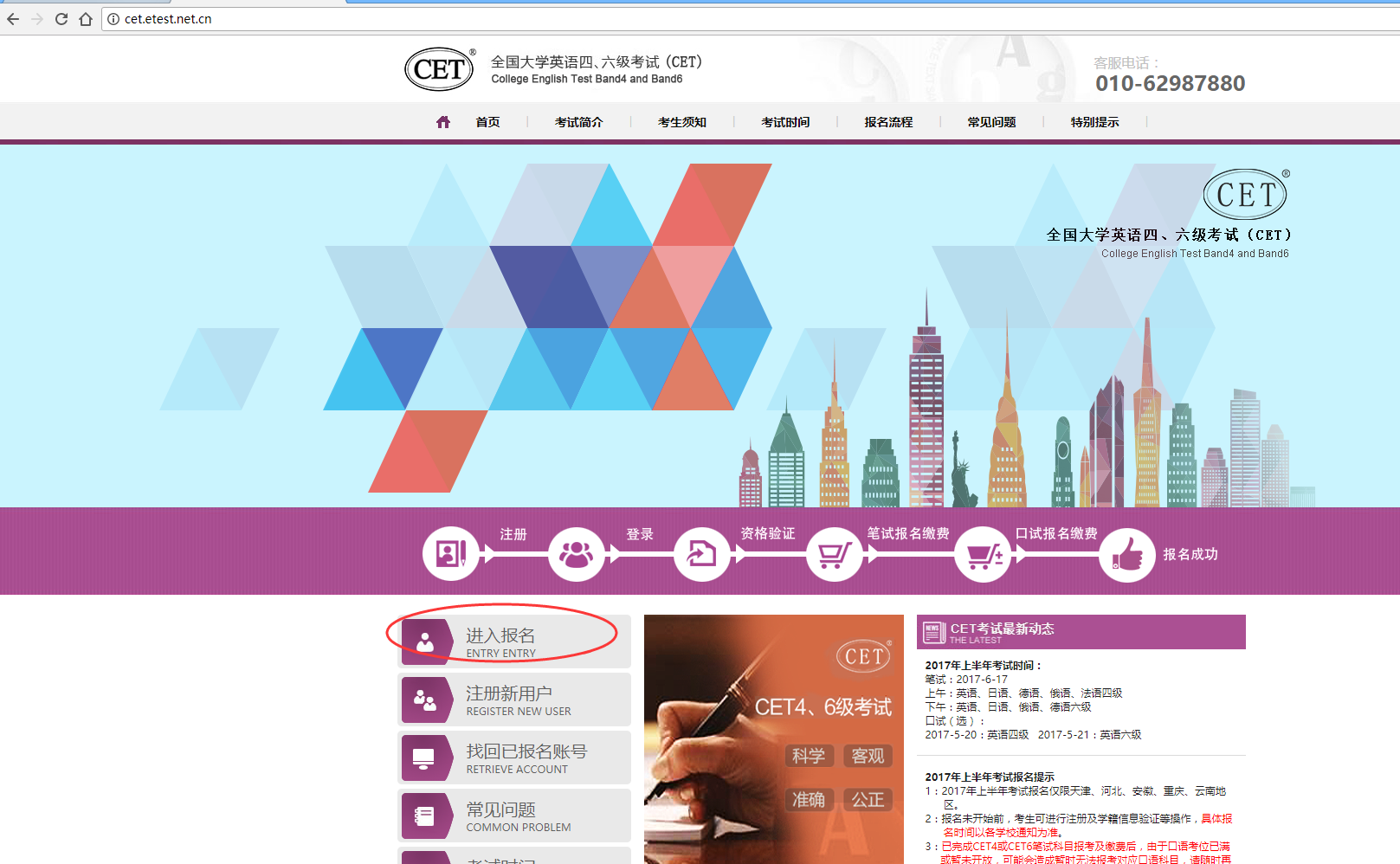 第一步: 打开全国大学英语四、六级考试报名网站(cet.etest.net.cn),点击“进入报名”。
