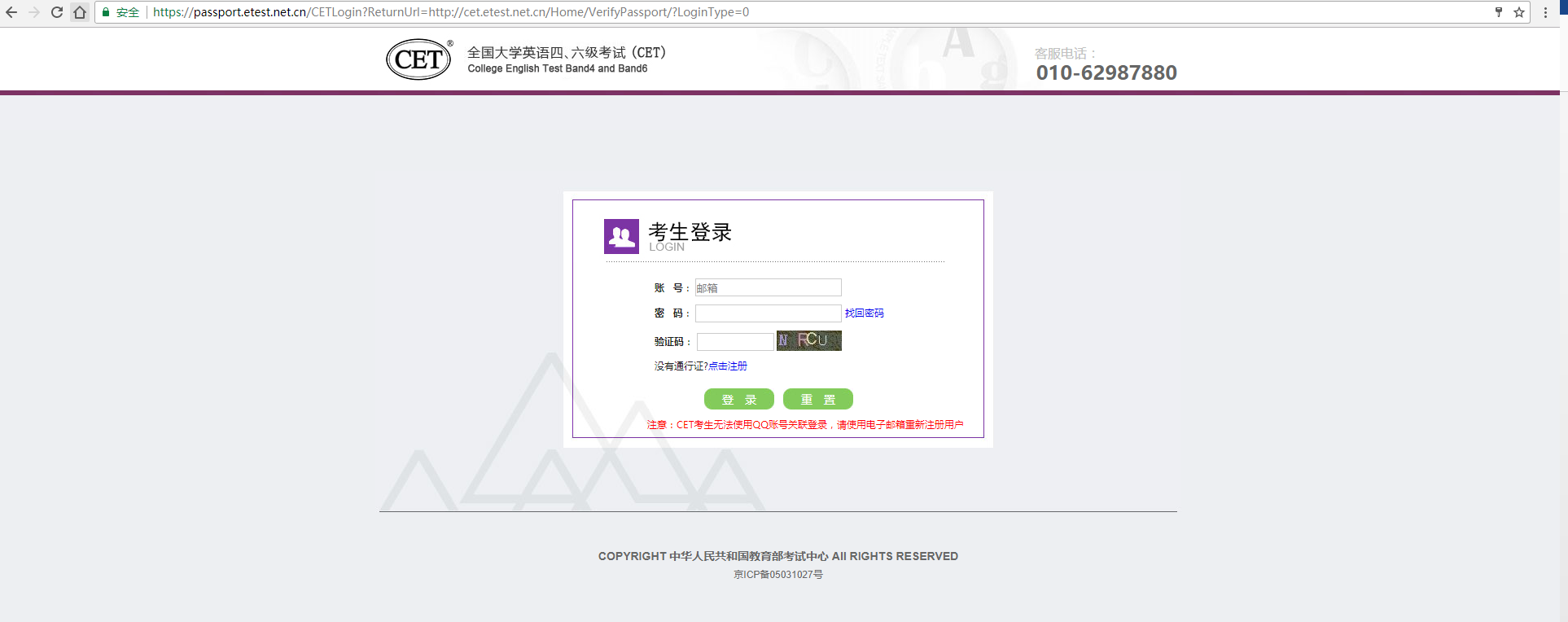第二步:进入考生登录页面。输入报名时的通行证账号(如果忘记了通行证账号,请看第五步)、密码(如忘记密码,点击页面“找回密码”找回)和随机验证码,点击“登录”。