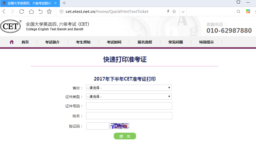 第一步: 打开全国大学英语四、六级考试报名网站(cet.etest.net.cn),点击“快速打印准考证”。