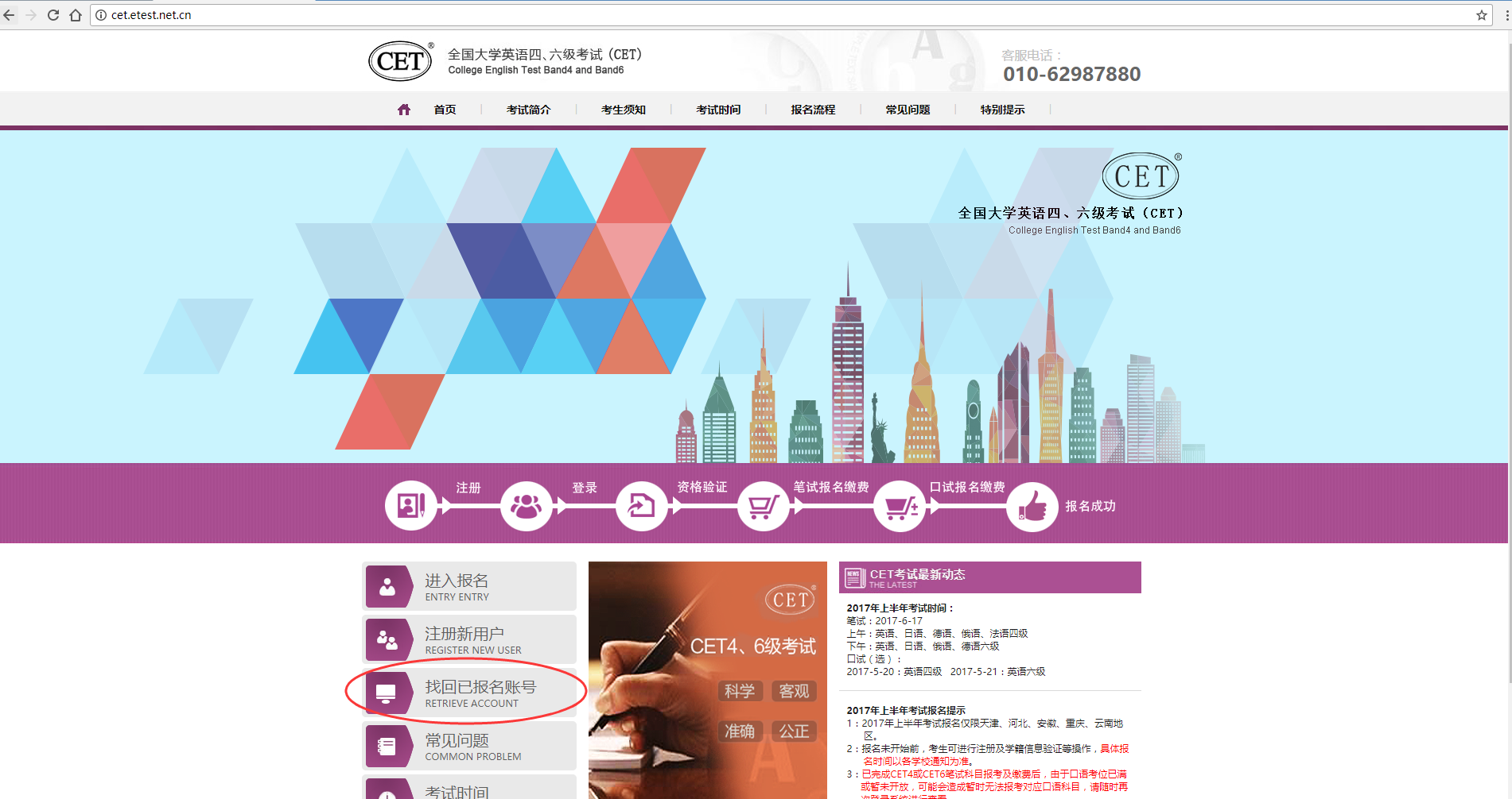第五步: 如果忘记了报名时的通行证账号,或登录后发现通行证账号非报名时的账号,可通过“找回已报名账号”方式找回。打开全国大学英语四、六级考试报名网站(cet.etest.net.cn),点击“找回已报名账号”。
