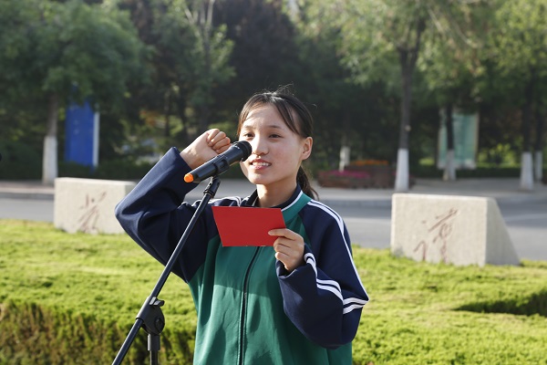 主持人宣布升旗仪式正式开始后, 标兵就位, 国旗护卫队的队员们迈着整齐的步伐,护送国旗入场,伴着庄严嘹亮的国歌,五星红旗冉冉升起,全体师生怀着崇敬与喜悦的心情,凝视着迎风飘扬的五星红旗,心中无比自豪。随后王昭彦同学慷慨激昂的进行了以爱国为主题的演讲,台下的观众十分认真入神地听着,仿佛在享受一场精神上的洗礼。最后在赵慧敏同学的领誓下,全体成员进行了“国旗下的誓言”宣誓活动。