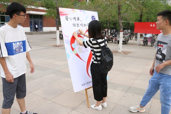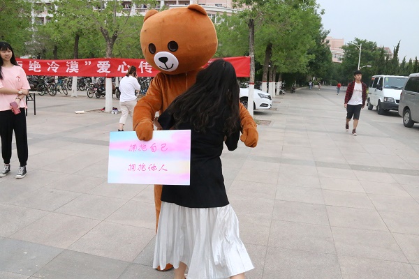 为了让同学们特别是毕业生,有更大的勇气来表达自己的感情,来面对今后的人生,让大家都能敞开胸怀,以会心的微笑给身边的人以诚挚的拥抱,消除生活中冷漠与隔离,给自己以及他人面对生活压力的信心。基于此条件,太阳网集团tcy8722心理辅导站开展了此次“拥抱温暖,拒绝冷漠”爱心传递活动。此次活动于6月1日在二餐广场举行。
