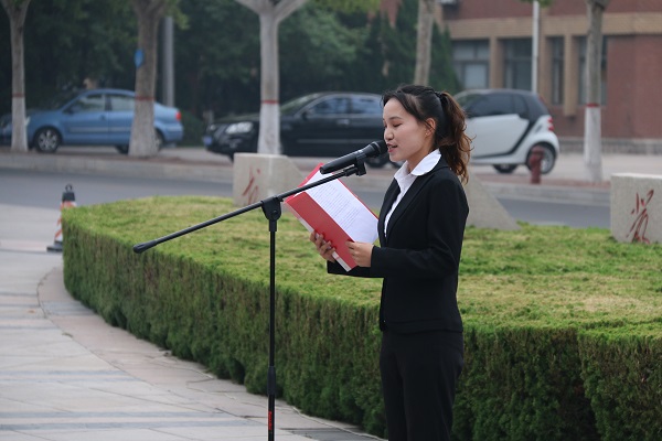 校学生会主席陈景荣主持仪式,迎着朝阳,国旗手护卫着国旗迈着矫健的步伐进场,随后,雄壮的国歌声响起,全场肃静,师生齐唱国歌、行注目礼,注视着五星红旗冉冉升起。紧接着,学生代表赵慧敏发表国旗下演讲,她号召同学们要铭记学校的教诲和老师的谆谆教导,发扬自强不息的滨院精神,牢记当代大学生应有的社会责任感与历史使命感。之后,由校学生会副秘书长王亮带领同学们在国旗下重温入团宣誓。最后,由团委书记刘宝民同志讲话,他首先肯定了全体师生在过去一学年取得的优秀成绩,同时勉励同学们努力学习,理性爱国,以自身的实际行动推动中华民族的伟大复兴。