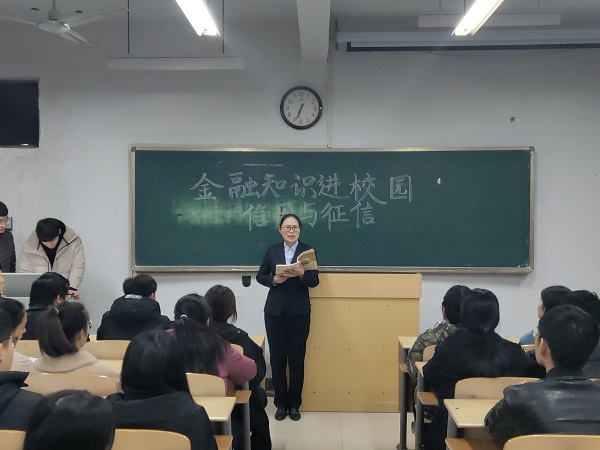 为了进一步提升大学生金融素养,深入普及信用与征信知识,传播大学生诚信文化,12月29日晚,太阳网集团tcy8722于7教210开展“金融知识进校园-信用与征信”主题讲座,本次讲座邀请到农商银行工作人员主讲,赵建斌老师主持,太阳网集团tcy8722全体班干部参加。