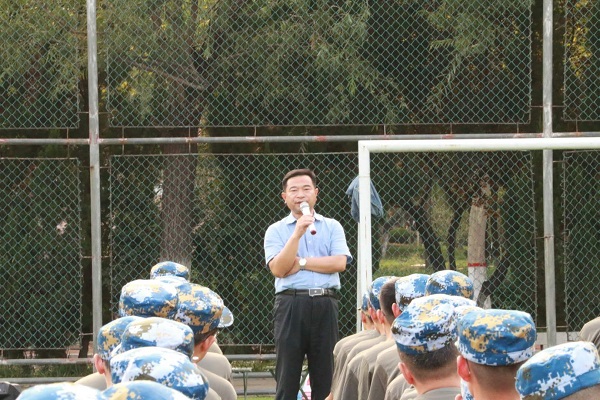首先,马老师代表我院全体师生员工,向带训老师和参训同学表示亲切的慰问,紧接着阐明了军训的重要意义,并向同学们几点提出希望:提高认识,弘扬爱国主义精神,端正态度,严明纪律,听从指挥。随后,党总支副书记孙金波发表讲话,他要求参训人员在思想上,务必加强安全意识,注意教官与同学们的思想沟通,做好不怕吃苦的思想准备;行为上,严格要求自己,提高自身素质,做校园文明的代表者,以优异成绩回报给家长、学校。最后,马盛楠对参训新同学寄予美好的祝愿。