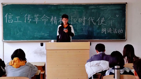 活动还未开始,选手们便早已整齐的坐在了教室里候场,在文艺部组织人员简单介绍完规则后,活动便正式开始,为纪念这令中华民族难忘的战斗年代,每一位选手的朗诵都充满着激情,又深藏着对革命先烈们的敬重,仿佛重温着从苦难到警醒,由悲壮到激昂,直至五星红旗飘扬升起的幕幕历史。台下的观众们静悄悄地观看,被一个个精彩节目深深吸引,随着主题演绎,表情由凝重到渐渐舒展,不时发出阵阵掌声。随着一位位选手的陆续上场,此次朗诵活动也接近尾声,最后伴随着紧张而又捉急的评比,此次“传承革命精神,弘扬中国气概”主题朗诵活动也完美落下帷幕。