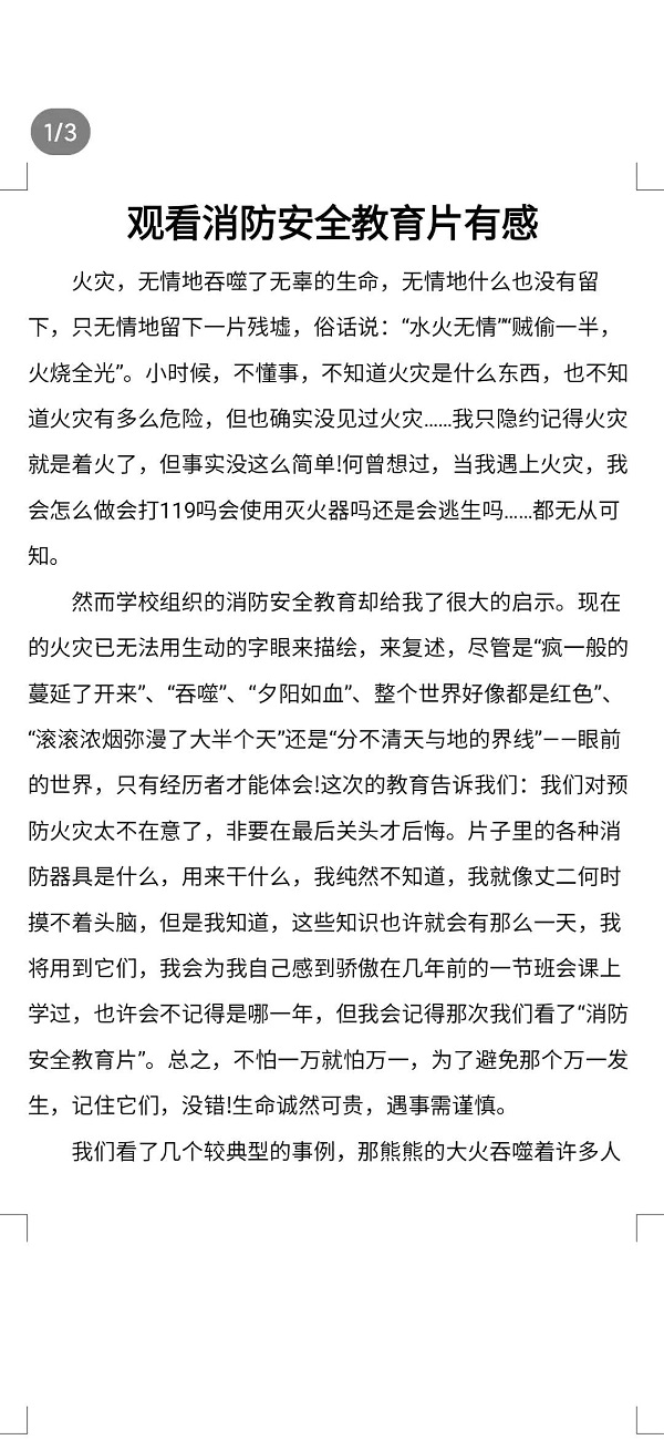 本次活动首先带领同学们观看了一场触目惊心的火灾警示教育片,使同学们学到了不少关于火灾自救以及如何避免火灾的知识。观影完毕后,同学们利用自己的课余生活写下了自己的对于这部火灾警示教育片的感受。在同学们的观后感中,描述了火灾的恐怖,学习到了如何预防火灾,以及自己在遇到火灾的应对措施,同时也培养了同学们应对突发事件的果断性和沉着冷静的品质。最后本次活动在观后感的评比中结束。