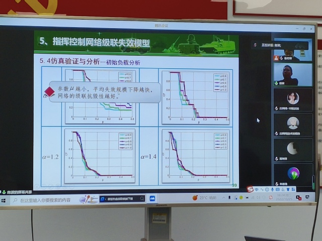 报告主要从指挥控制网络研究现状、指挥控制网络建模方法、关键节点识别方法、关键边识别方法、失效控制等五方面展开,详细讲授了指挥控制网络抗毁策略研究中的一系列关键问题。陈教授报告内容深刻,逻辑性强,讲解清晰,深受老师和学生们欢迎。报告结束后,陈教授和聆听报告的师生就指挥控制网络抗毁策略研究的热点问题深入探讨,并对教师提出的问题解答,现场氛围活跃。