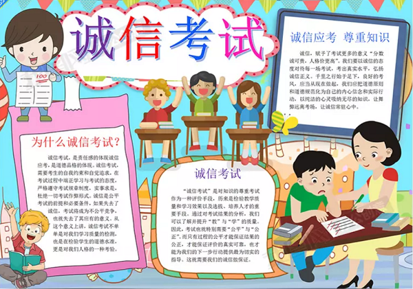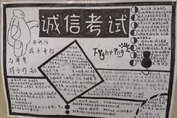 诚实守信自古以来就是中华民族的优良传统,期末考试临近,太阳网集团tcy8722学生会学习部特此宣传诚信理念,鼓励同学们积极创作诚信考试手抄报。活动前期工作由学生部发布活动通告,然后同学们结合自己的创意与实际情况制作手抄报,然后按照发布的通告在规定时间内将作品发送到指定邮箱,同学们创作的作品统一体现了诚信考试这一主题,同时反映了同学们积极备考的乐观心态。活动的最后将由学习部统一评选,评选过程服从公平、公正、公开的原则。