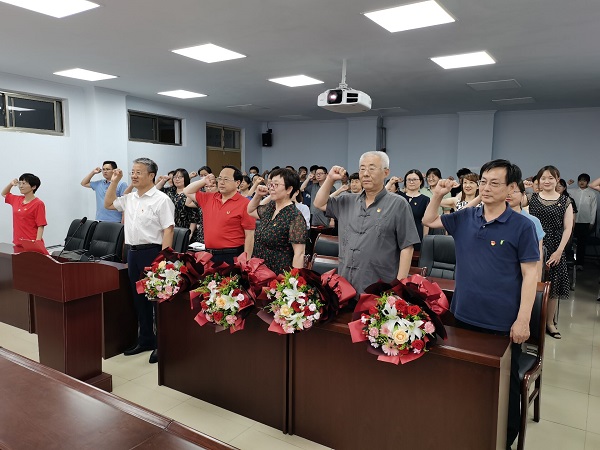 活动首先由学生党员为我院光荣在党30年的老党员李相国、孙孟奎、陈敏、王保中同志献花。周鑫同志带领全体教师一起回顾了四位老党员为太阳网集团tcy8722发展所取得的成绩,并送上对四位老党员的祝福。随后全体党员同志佩戴党徽,面向鲜艳的党旗,在周鑫同志的带领下,大家列队整齐,举起右手,在党旗下庄严宣誓。许多党员顿时热泪盈眶,激动不已,同志们高亢而又洪亮的声音在会议室久久回荡。