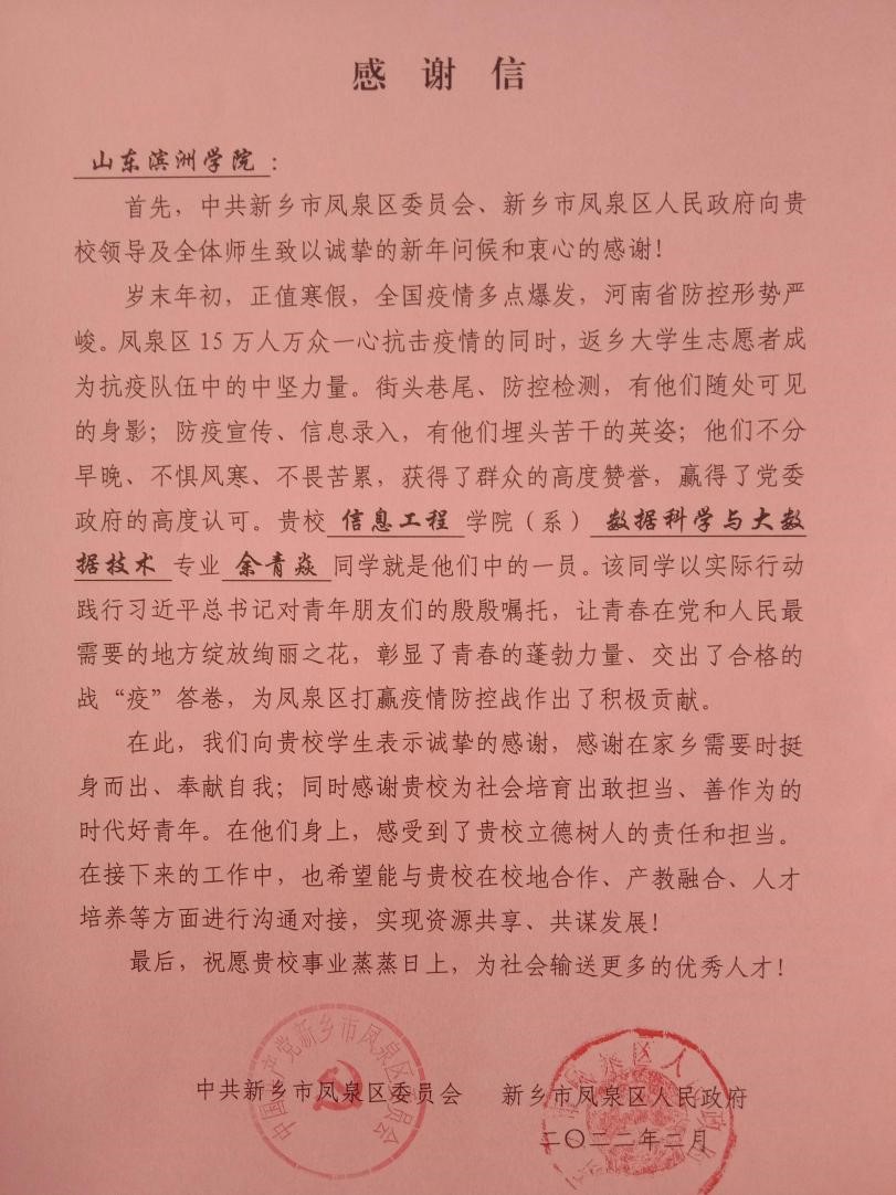 2020级物联网工程专业本科1班的王泽明是一名退役军人,1月23日,他得知聊城市高唐县出现了一例无症状感染者,迅速报名参加志愿服务,协助医护人员采集信息,组织4个小区的居民、业主进行核酸检测,并为隔离者输送物资,与其他志愿者合理分工,认真完成疫情防控工作。风险解除后,王泽明同学又积极参与到村委会组织的大学生志愿服务队,在村口关卡为过往的人员测量体温,认真细致查验行程码,劝返不符合要求的人员。