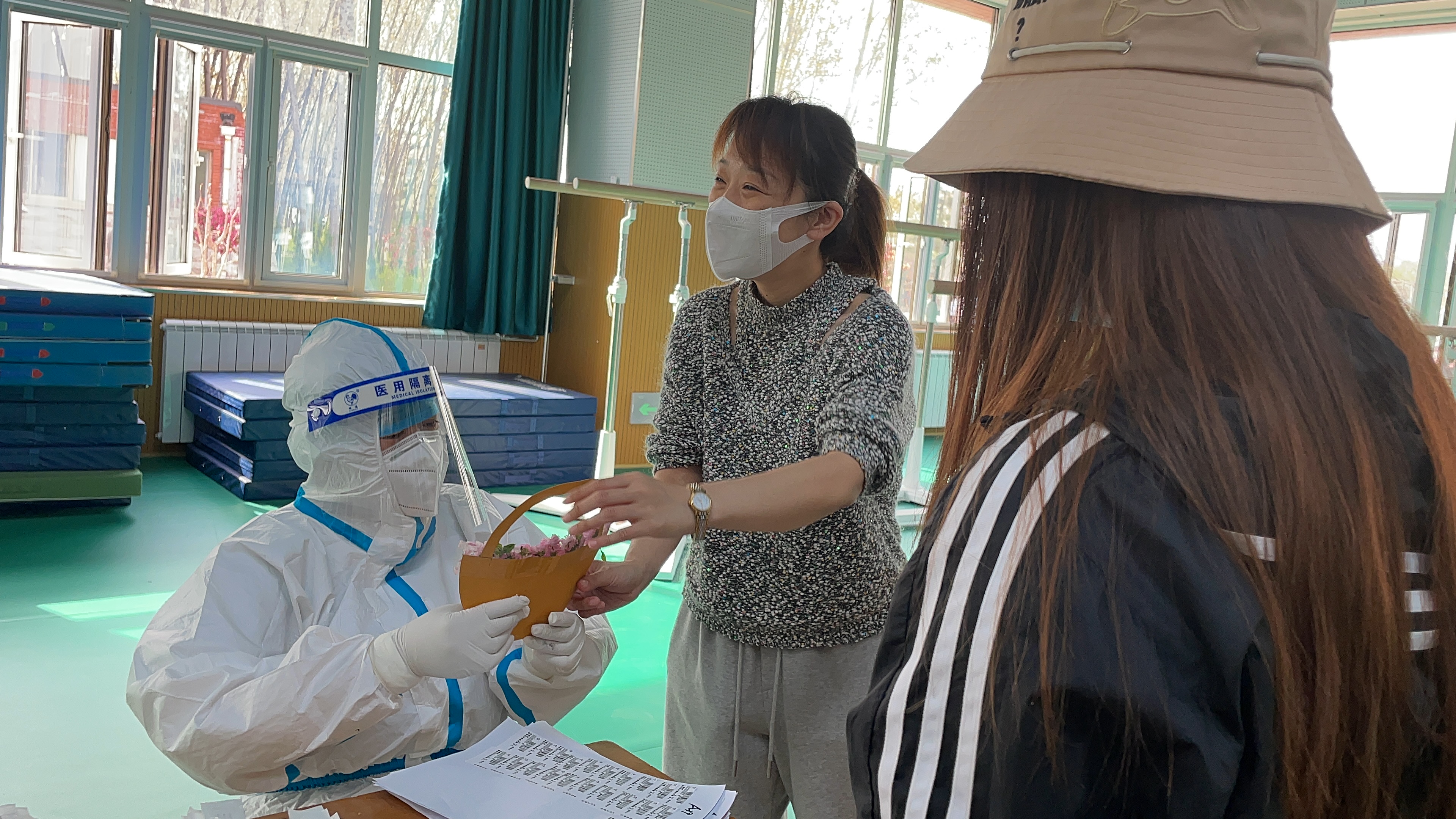 学生们把彩色卡纸裁剪成花篮的模样,然后在校园中寻觅好看的花朵,用胶带和双面胶将各色鲜艳的花朵固定在小花篮上。学生和老师做完核酸检测后并没有着急离开,而是为学校“大白”献上自己精心制作的花篮,并对他们表示了感激,“大白”也因此露出了灿烂的笑容。疫情爆发以来,医护工作者们坚持守护在同学们身边,保证同学们的安全,借此机会将同学们心中的感激表达出来,感谢他们的用心守护。”