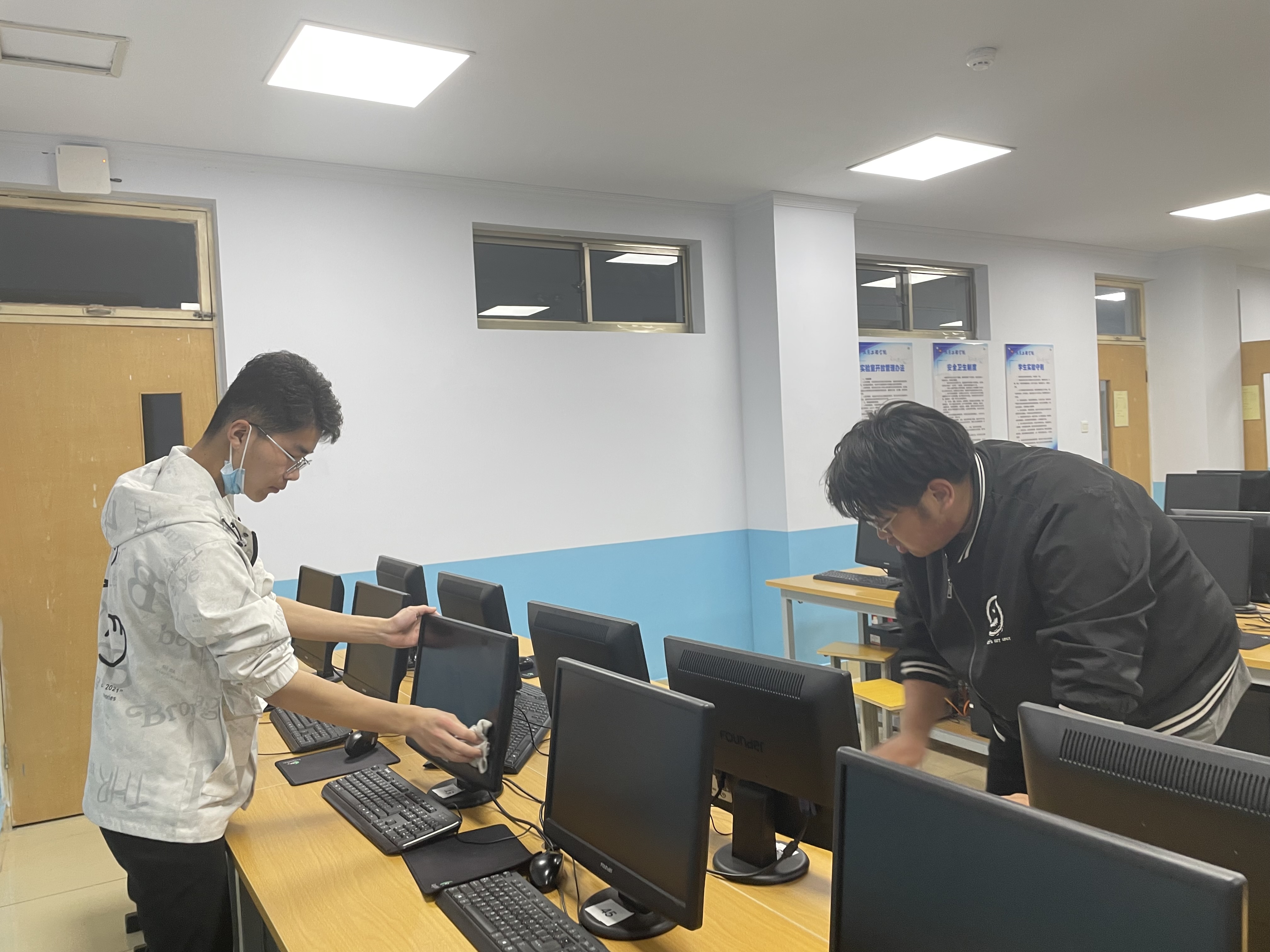 当晚7时,各志愿者在信息楼下集合完毕,经组织者安排,分批前往负责机房。到达各自负责机房后,机房负责老师对大家先进行了简单的任务分配及劳动工具的分发,有的拿着抹布擦拭屏幕键盘上的灰尘,有的拿着扫帚清扫地面上的垃圾,有的对机房的凳子进行标注,大家分工合作,有条不紊地对机房进行了全方位的打扫,做到了不留死角,经过一番“奋战”的机房变得干净整洁、焕然一新。