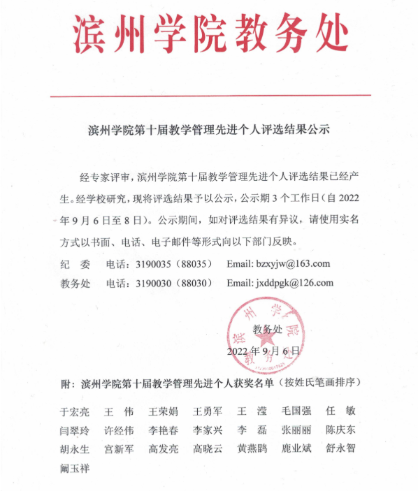 经专家评审,滨州学院第十届教学管理先进个人评选结果已经产生。我院任敏、胡永生两名教师被评为滨州学院第十届教学管理先进个人。全院教职工要以先进个人为榜样,进一步拉高标杆、加压奋进、创先争优、开拓创新,为我院发展作出新的贡献。