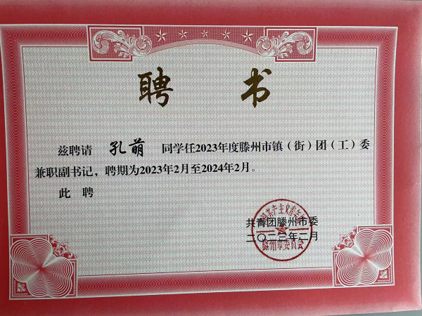 孔萌是滕州市街(镇)团(工)委兼职副书记,自2022年暑期在山东省滕州市姜屯镇政府参加青年计划实践以来,孔萌一直保持与镇政府的联系,2023年寒假期间多次利用业余时间赴镇政府开展志愿服务,获得单位领导和同事的广泛好评。
