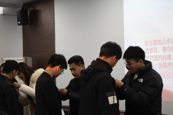 入团仪式在庄严的国歌声中隆重拉开帷幕,与会学生全体起立,奏唱国歌。首先,由辅导员孙天棋宣读新团员名单,为成功入团的同学表示祝贺。随后,三位老师为全体新团员佩戴团徽。紧接着,辅导员张智超带领大家进行入团宣誓。全体新老团员高举右拳,以饱满的精神面貌向团组织坚定表明为共产主义事业而奋斗的理想信念。最后,辅导员尹宁讲述了入团的意义,并对全体新团员致以祝贺,希望全体新团员能按照团员标准严格要求自己,承担起团员应该承担的责任,遵守团的纪律,虚心学习,付出行动,不仅在组织上入团,更要在思想上、行动上入团!