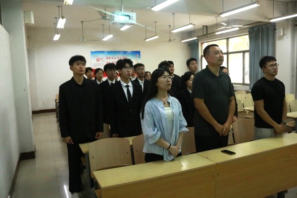 仪式在庄严的国歌声中拉开帷幕,参会人员全体起立,齐声高唱国歌。主持人宣读新团员名单,孙天棋、王迪老师为新团员们佩戴团徽,颁发团员证,这标志着他们光荣地成为了中国共产主义青年团的一员。