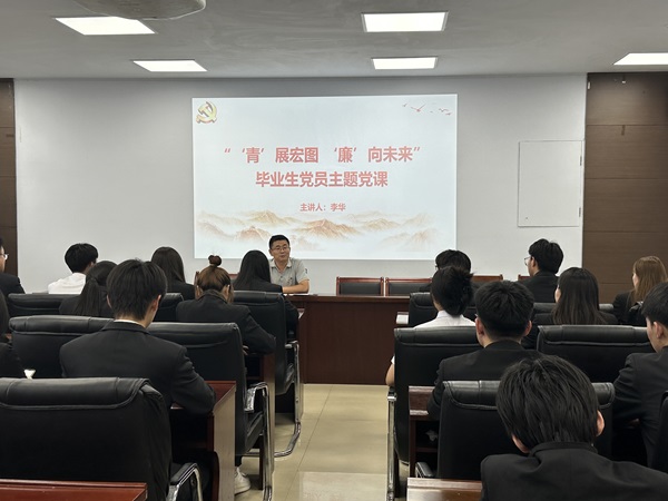 李华书记以“‘展宏图·向未来为主题,为毕业生党员讲授党课。他寄语毕业生党员们,在未来的工作和学习中要将廉洁作为规范行为的准则,将廉洁当作坚守初心的信条,将廉洁视为引领风尚的旗帜,同时鼓励大家彰显青年党员的担当,为实现中华民族伟大复兴的中国梦贡献青春力量。