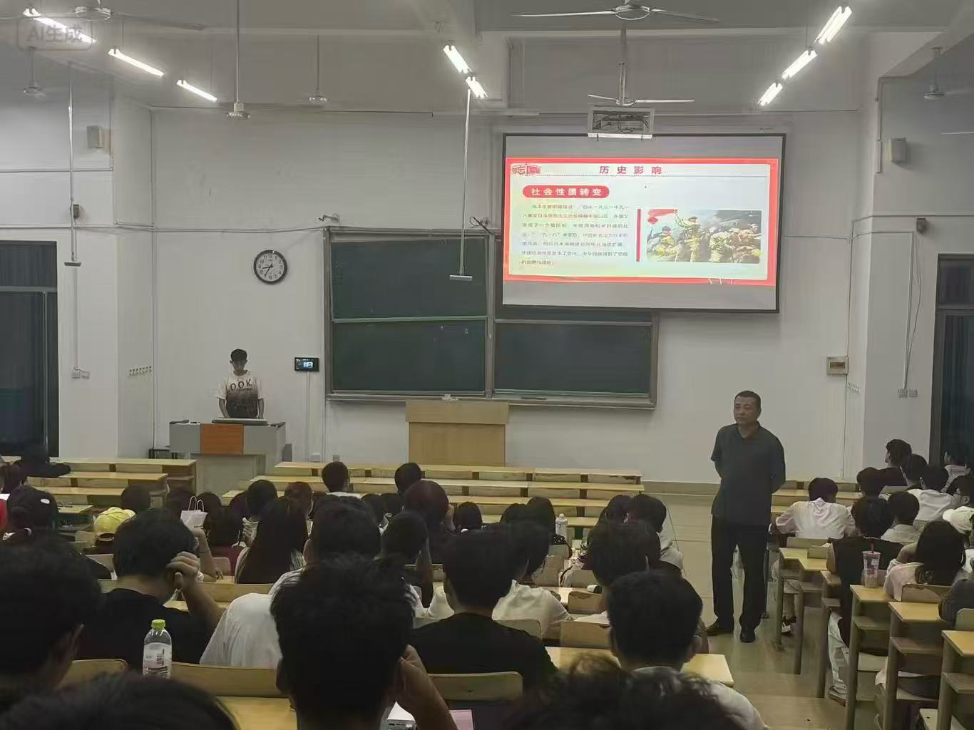 活动以专题宣讲为核心环节。张老师围绕“事件背景、事件经过、历史影响、抗战思源、警钟长鸣”五大板块,结合珍贵历史影像与权威史料,系统梳理“九一八”事变的来龙去脉。从日本侵略者的阴谋布局,到东北军民的浴血抵抗,再到事变对中华民族命运的深远影响,他的讲解史实严谨、条理清晰,让学子们深刻领悟“落后就要挨打”的历史教训,也更加珍视当下的和平生活。课堂上,学生代表们全神贯注,在一个个历史细节中回溯那段屈辱与抗争的岁月,爱国之情在心中久久激荡。