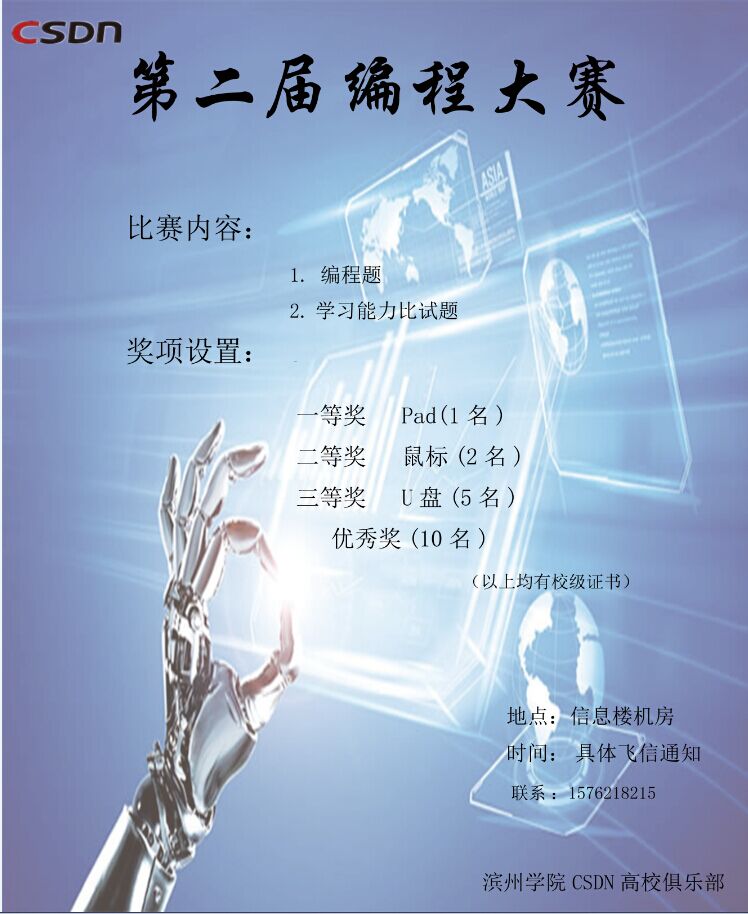 信息工程系于4月27日正式启动第二届编程比赛报名,并于28日在二餐广场举行外场宣传活动。 本次比赛由信息...