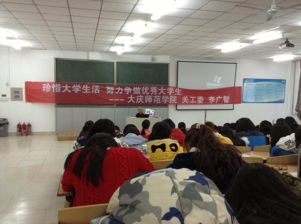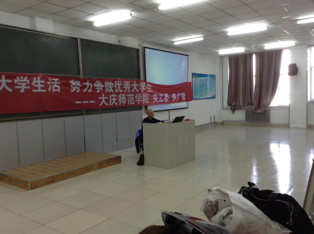 2014年10月23,我院有幸邀请到大庆油田关工委李广智先生,为我院学生进行“珍惜大学生活,努力争做优秀大学生”的专题讲座。目的是引导学生,尤其是少数民族学生抓住机会,珍惜青春,努力向上,不断传递正能量。李广智先生的讲话非常幽默,报告十分精彩,他说:“其实在座所有同学离开“家”这个温暖的巢穴,会有很多原因使大家感到迷茫。比如思念家人、不太熟悉的寝室同学、老师、校园环境等等,但是总有一天我们每个人都要独自飞翔所以进入大学要学会坚强,要让自己尽快适应,然后你会发现一切原来生活才刚刚开始。你们唐老师办公室的墙上贴着这样一张纸:大学四年共有1460天,但是你能有多少属于学习的时间,答案是它只占你大学生活的3.94%,多么可怕的数字啊!”