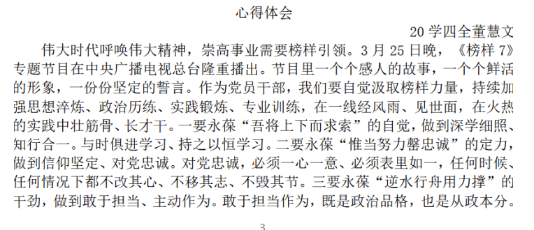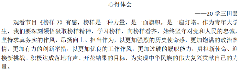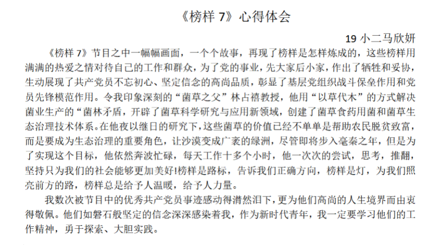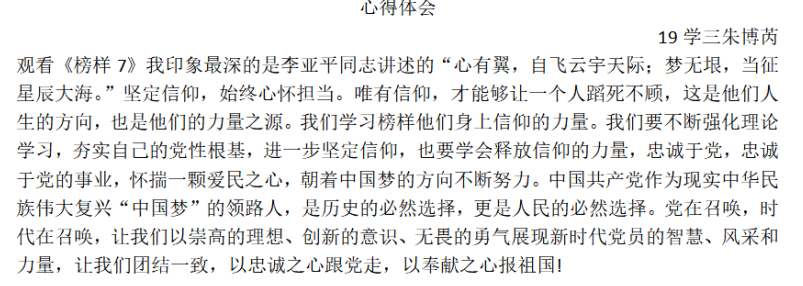 学生党支部党员同志们在收看《榜样7》专题节目后,全体展开了热烈的讨论,并积极撰写自己的心得体会。通过观看《榜样7》专题节目,党员同志们深刻认识到如何从榜样身上汲取党的强大力量,党的优秀作风和党的优良传统,并促使其从“内化于心”推进至“外化为行”。鼓舞党员同志们以功勋模范人物为榜样,不断培养爱国之情、砥砺强国之志、实践报国之情。