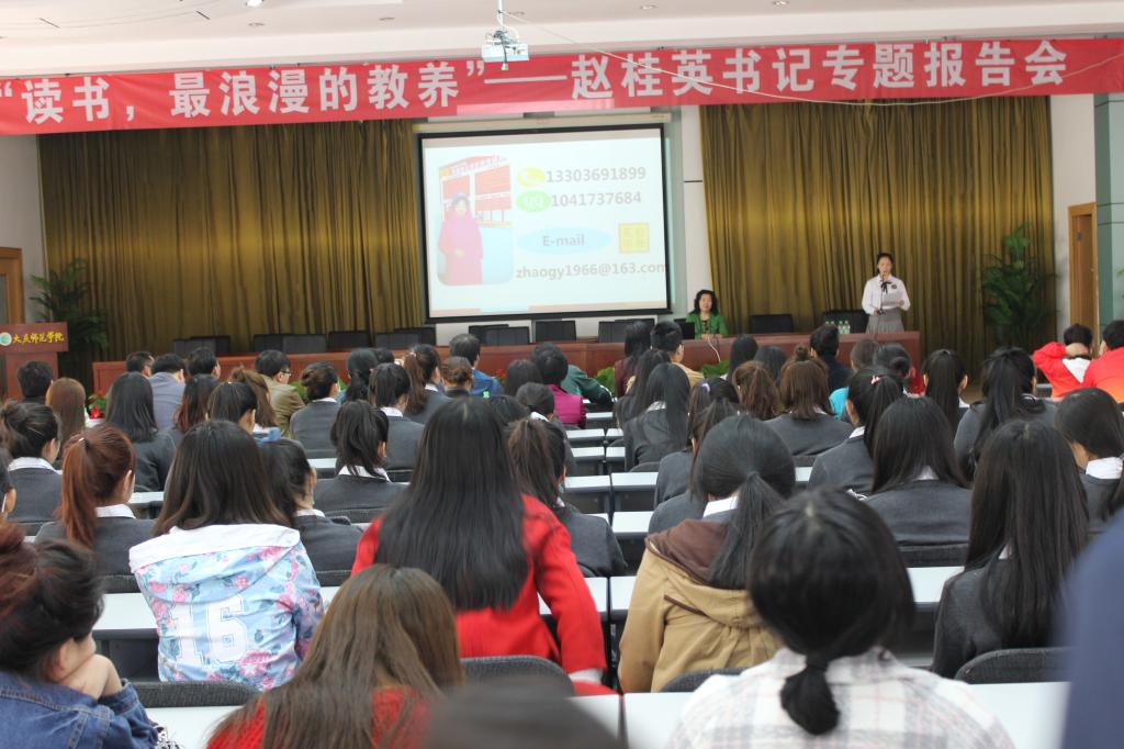 2016年5月4日下午,值此第67个五四青年节来临之际,为了激发我校青年学生的读书热情,引导学生弘扬传统文化,养成良好的读书习惯,由大庆师范学院党委学生工作部(团委)主办、教师教育学院承办的“读书,最浪漫的教养”——赵桂英书记专题报告会在铁人讲堂举行。党委学工部部长郭春满,学生工作处及十二个院系的老师和同学们参加了报告会。