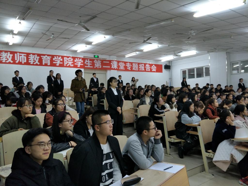 10月31日晚18点30分教师教育学院在主楼1-1召开“教师教育学院学生第二课堂专题报告会”。会议由副院长高扬主持,学生会学生职业技能部全体成员、学生规范汉字书写小先生、2017级学前教育、数学与应用数学专业学生参加报告会。