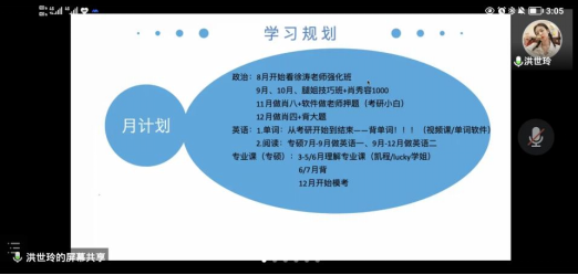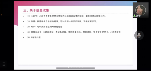 在经验分享环节中,三位同学结合自身的考研经历,先后围绕择校、专业课备考、公共课备考、教学资源收集、复习规划制定等核心问题向大家做了详细的讲解,并就如何平衡专业课与公共课复习时间给出了各自的意见,为同学们提供了宝贵经验。