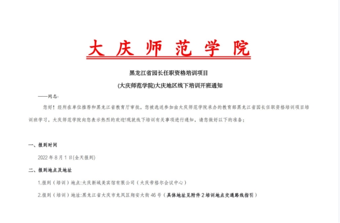 受黑龙江省教育厅和大庆市、齐齐哈尔市教育局委托,我校承办了2022年全省幼儿园园长任职资格培训班。在进行了为期五天的线上培训后,8月1日上午,在大庆市教育局与大庆师范学院教师教育学院的精心策划下,经多方审慎研究,严格遵守疫情防控各项规章及要求,我校顺利开展2022年黑龙江省幼儿园园长岗位任职资格第二期线下培训(大庆地区),学员报到率高达90%以上。