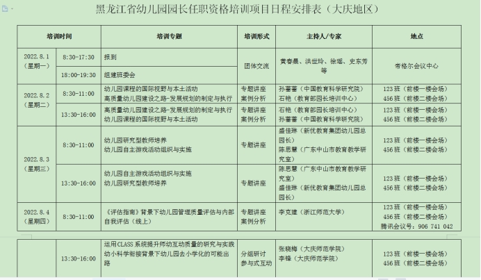 幼儿园园长任职资格培训班是我校为贯彻落实幼儿园园长持证上岗制度而承办的培训项目,本项目是学习贯彻习近平总书记关于教育的重要论述和全国教育大会精神的重要举措,为我省大庆和齐齐哈尔地区办好人民满意的幼儿教育,开创幼教事业高质量发展新局面,打造一批高水平、专业化的园长队伍,打下夯实基础。
