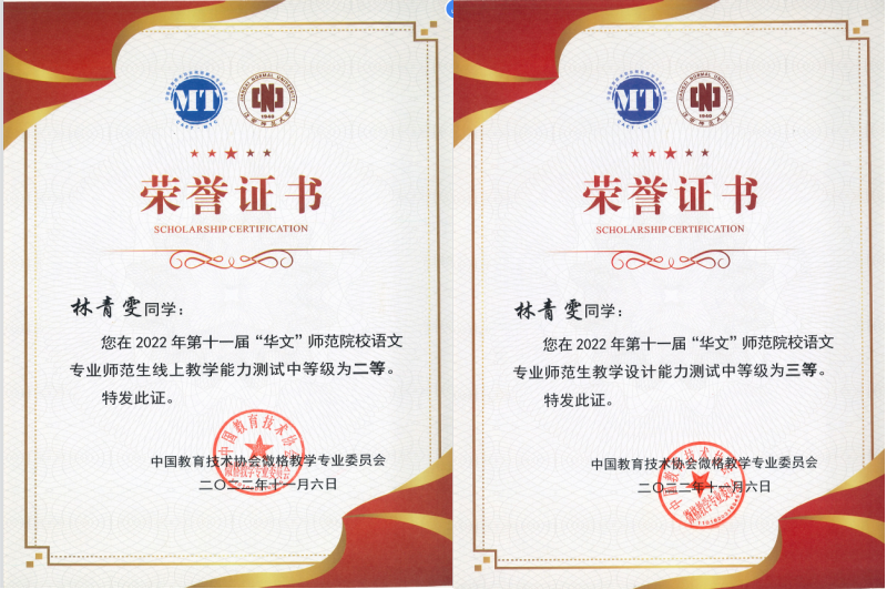 教师教育学院小学教育专业林青雯同学在闵海燕老师的指导下荣获线上教学能力测试二等奖,教学设计能力测试三等奖。