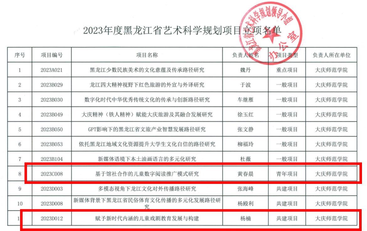 近日,黑龙江省文化和旅游厅公布了2023年黑龙江省艺术科学规划项目立项结果,我院教师在此次项目立项中获批青年项目1项,共建项目1项。此次省级科研项目的获批促进了我院整体科研水平的又一次提升,为我院科研工作的整体发展夯实了基础。