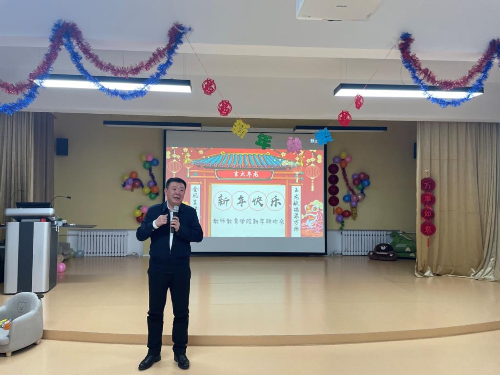 又是一个辞旧迎新、岁月更迭。为了梳理过去一年难忘的时光,盘点团结奋斗取得的成果,为做好2024年各项工作凝心聚力、加油鼓劲,1月6日下午教师教育学院召开2024新年茶话会暨2023工作总结会。副校长许双毅与全体教师、学生代表欢聚一堂,说友情、做游戏、送祝福、谈成绩,包饺子、划未来,为新的一年带来美好祝愿!