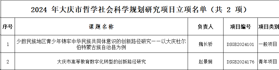 大庆市哲学社会科学规划办公室公示了《关于2024 年大庆市哲学社会科学规划研究项目立项名单》,我院教师在此次项目立项中获批2项,分别是魏长骄老师主持的《少数民族地区青少年铸牢中华民族共同体意识的创新路径研究——以大庆杜尔伯特蒙古族自治县为例》和赵景娴老师主持的《大庆市高等教育数字化转型的创新路径研究》。