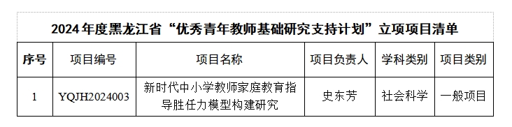 近日,黑龙江省教育厅公布了2024年度黑龙江省“优秀青年教师基础研究支持计划”立项评审结果,我院教师在此次项目立项中获批一般项目1项。此次省级科研项目的获批,不仅是对我院教师科研能力的肯定,更是对学院整体科研水平提升和科研氛围营造的一次重要推动,激发了大家投身科研的热情与信心。同时,这也标志着我院在科研管理和支持机制上的不断完善,为今后更多优秀科研项目的申报和立项奠定了坚实基础。