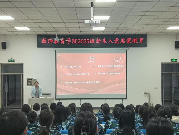 为引导青年学生厚植家国情怀,筑牢信仰根基,教师教育学院于2025年9月16日在第六教学楼阶梯教室召开了2025级新生入党启蒙教育大会,旨在点燃同学们的政治热忱,续写新时代青年与党同行的青春篇章。本次会议由我院学生党支部书记熊巍老师主持,2025级全体新生参加。