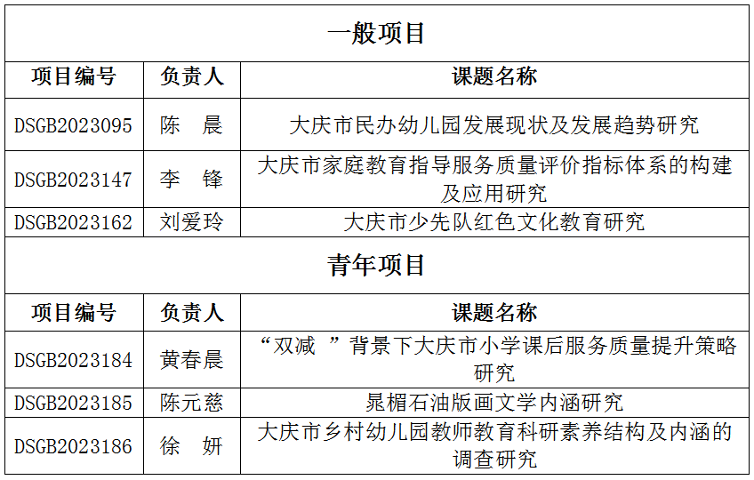 近日,大庆市哲学社会科学规划办公室公示了关于 2023 年大庆市哲学社会科学规划研究项目立项名单,我院教师在此次项目立项中获批一般项目3项,青年项目3项。此次科研项目的获批为我院今年的科研工作实现新跨越打下了坚实的基础。