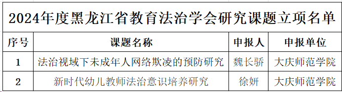 我院两位青年教师成功获批2024 年度黑龙江省教育法治学会研究课题,分别是魏长骄老师主持的《法治视域下未成年人网络欺凌的预防研究》和徐妍老师主持的《新时代幼儿教师法治意识培养研究》。两项课题的获批,体现了我院青年教师的科研能力逐步提升,也进一步在学院内营造了更加积极的科研氛围。