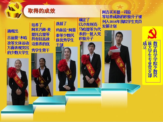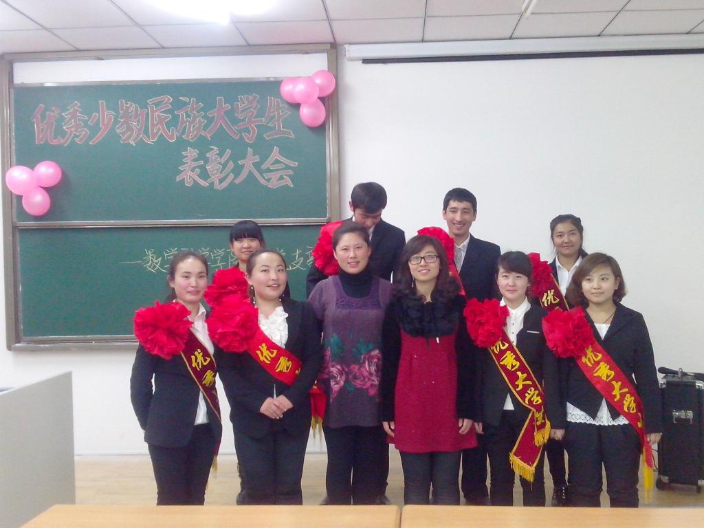 2013年11月18日,围绕主题活动的开展,我院隆重召开了少数民族大学生表彰大会,表彰了在学习、生活、工作、文体活动等方面表现突出的少数民族大学生。选拔了玛依拉·阿曼太等一批优秀的少数民族学生干部,培养了阿米乃姆等具有较高政治素养的优秀少数民族大学生骨干,确定了以沙肯别克等为代表的少数民族大学生积极分子,使他们能够端正入党动机,积极主动向党组织靠拢,阿吉买买提·司拉等培养成熟的部分积极分子被列入2014年我院学生党员发展计划,通过这些优秀的少数民族大学生的榜样示范作用,影响了其他少数民族学生积极上进,成长成才。