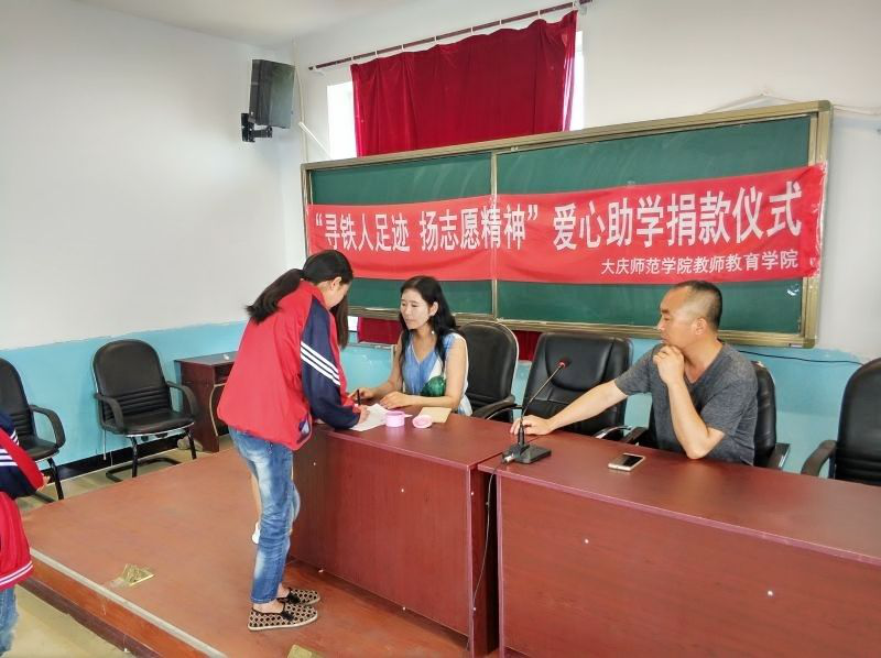 第一幕:蓝天、白云、马路、骄阳,构成了一幅美丽的风景画,“师院暖阳”团队大手牵小手为留守学生送去爱心,“寻铁人足迹·扬志愿精神”的爱心助学捐赠活动在明德学校少年宫活动室启动,本次共捐助了4名家庭特别贫困的留守学生,每名学生得到了1000元的资助,保证他们一学年的学杂费和学习资料等费用。