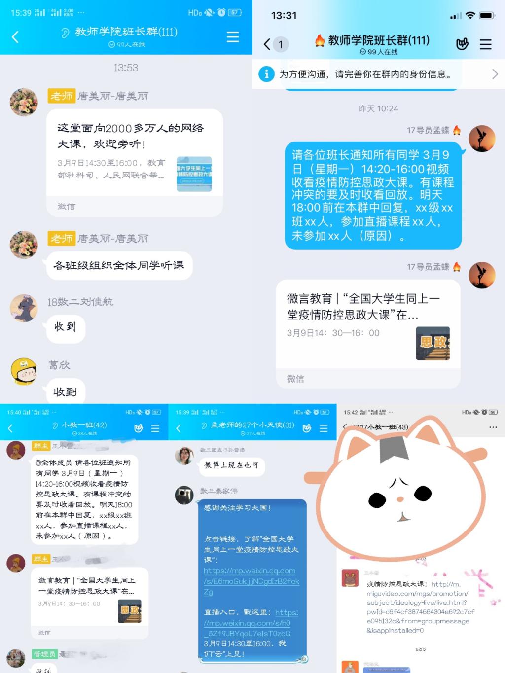 其次,我院辅导员老师以多种形式号召广大同学进行学习:在QQ班级群、微信班级群进行转发通知,有的班级结合自身实际情况,在周末班级例会上进行“云”动员;充分发挥班干部作用,以班级为单位分享宣传。并提醒大家,若有需要可提前下载相关软件。