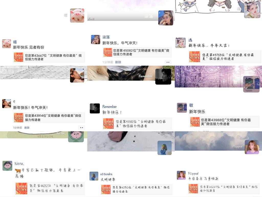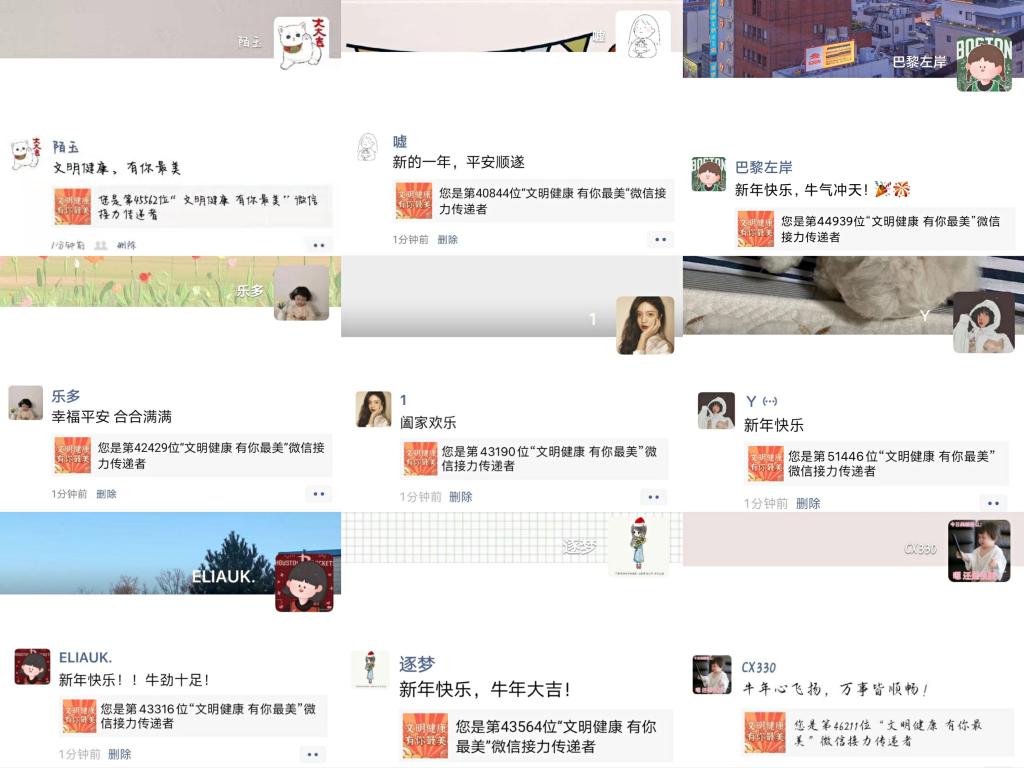 除了站在前线的志愿者们,更多安心居家的同学们也通过微信接力的方式秀出了自家团圆照,送出了自己的新年祝福。不同以往挨家挨户上门送祝福的拜年方式,今年同学们采取线上送祝福的方式通过“团圆夜——抗疫最美”这个接力活动将所有团圆照挂在了一张墙上,全网共庆、阖家团圆,此情此景任谁都忍不住赞一声美哉!