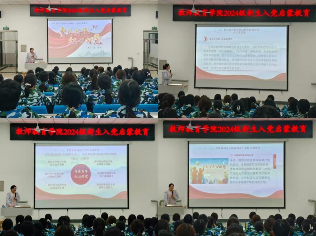 为深化大学生理想信念教育,激发青年学生政治热情,号召新生积极向党组织靠拢,我院于9月6日在系楼阶梯教室开展以“青春百年,红心向党”为主题的2024级新生入党启蒙教育活动。本次活动由我院学生党支部书记熊巍老师主讲,2024级全体学生参加。
