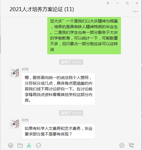 张晓梅院长首先介绍了我院本次修订工作的安排。7月20日学院根据学校指导性意见,制定了《教师教育学院关于修订2021级本科专业人才培养方案的工作安排》,对我院人才培养方案修订工作进行了总体布置,提出由专业负责人牵头,系部主任组织实施,广泛征求相关方意见的修订原则。8月5日,各系部主任提交了修订建议清单。学院组织线上会议就相关建议进行讨论,结合前期对用人单位、毕业生、教育主管部门等相关利益方的调研结果,对照“师范专业认证标准”“教师教育课程标准”“教师专业标准”“师范生教师职业能力标准”等文件精神提出修改建议。8月15日各专业提交修订初稿,通过建立“教师教育学院人才培养方案修订小组微信群”进行线上审阅。8月21日召开修订小组钉钉会议,进一步对方案中的培养目标、毕业要求的表述进行细致推敲,在此基础上完成修订二稿。