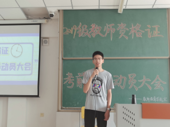 大会开始, 熊巍老师指出了考教师资格证的重要性,对同学们的毕业、就业都会产生极大的影响,为了提高同学们的备考积极性,特别邀请了分别来自小学教育专业、学前教育专业顺利通过“教师资格证”笔试和面试的张嘉麟学长和韩常瑜学姐为大家做考前动员和经验分享。